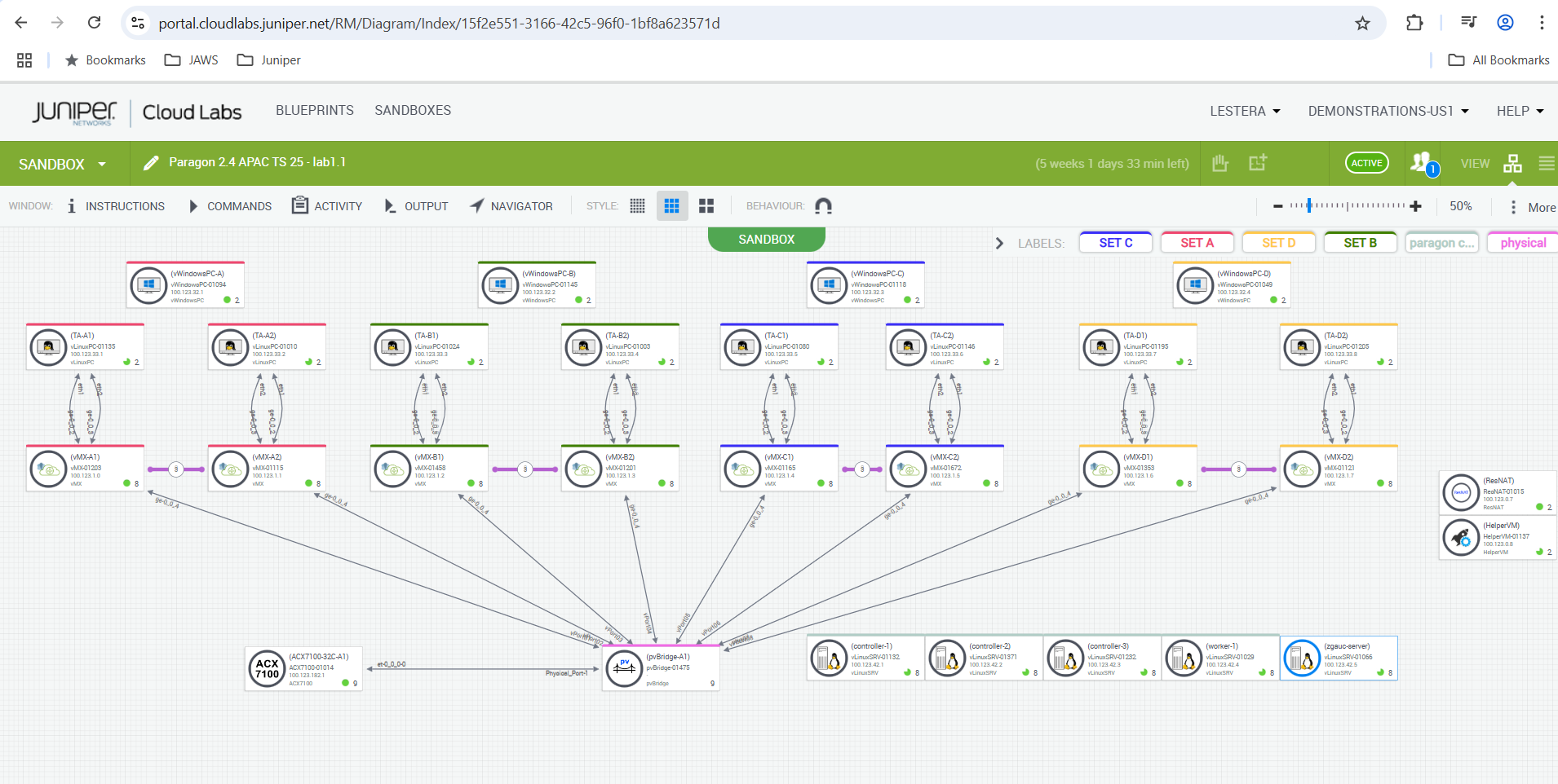 The blueprint consists of sets of 2 vMX devices and Routing Director 2.4.0, A single set (one of SETA, SETB, SETC, SETD) is allocated to the user. Please make sure to identify the correct allocation set so as not to get into another users way.