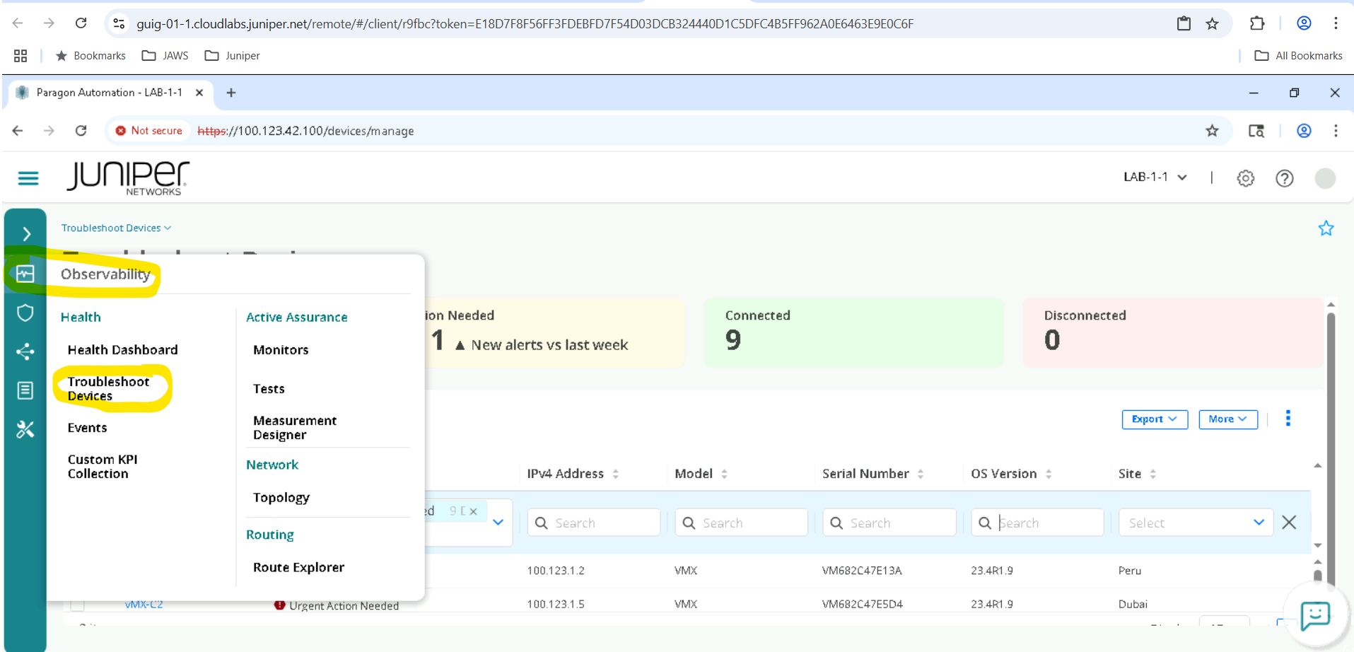 In the Routing Director GUI on the left side pane, go to Observability > Troubleshoot Devices.