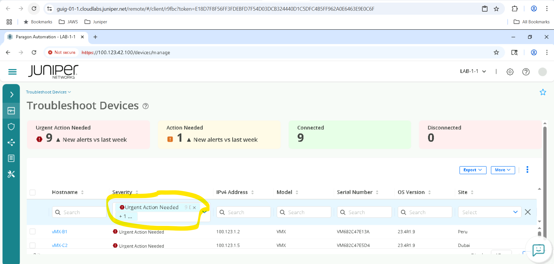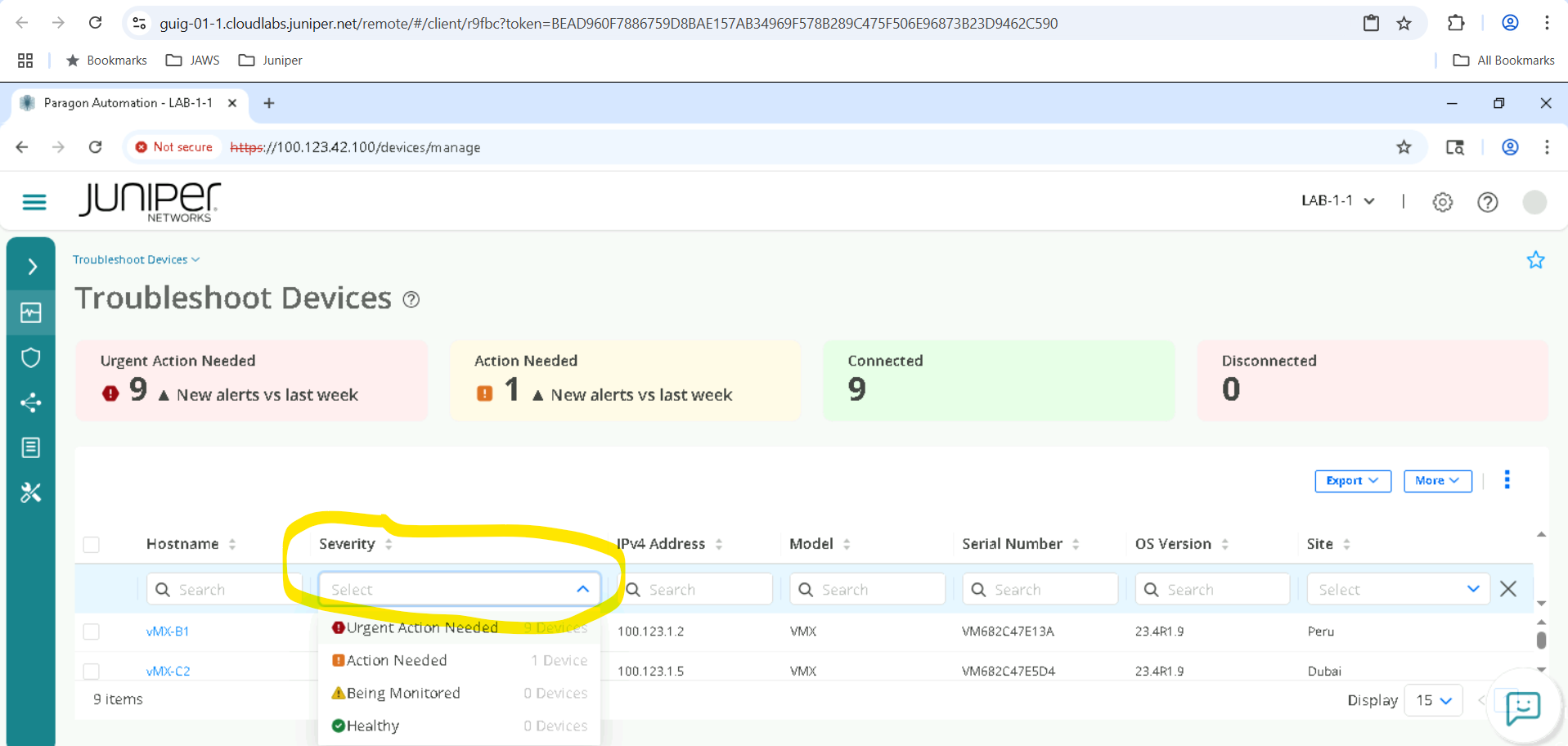 We need to clear the Severity Filter to view all the devices , go ahead and click on X inside the Severity column to remove Urgent Action Needed and other filters. We must make sure everything is unselected here , so all devices are visible.