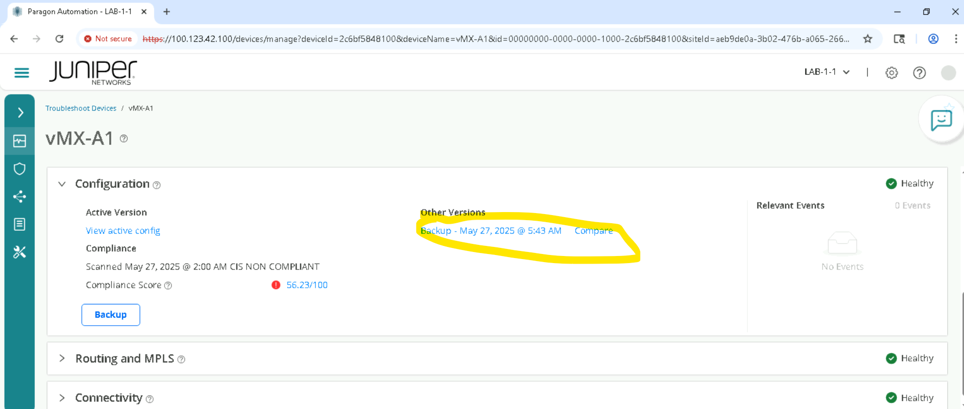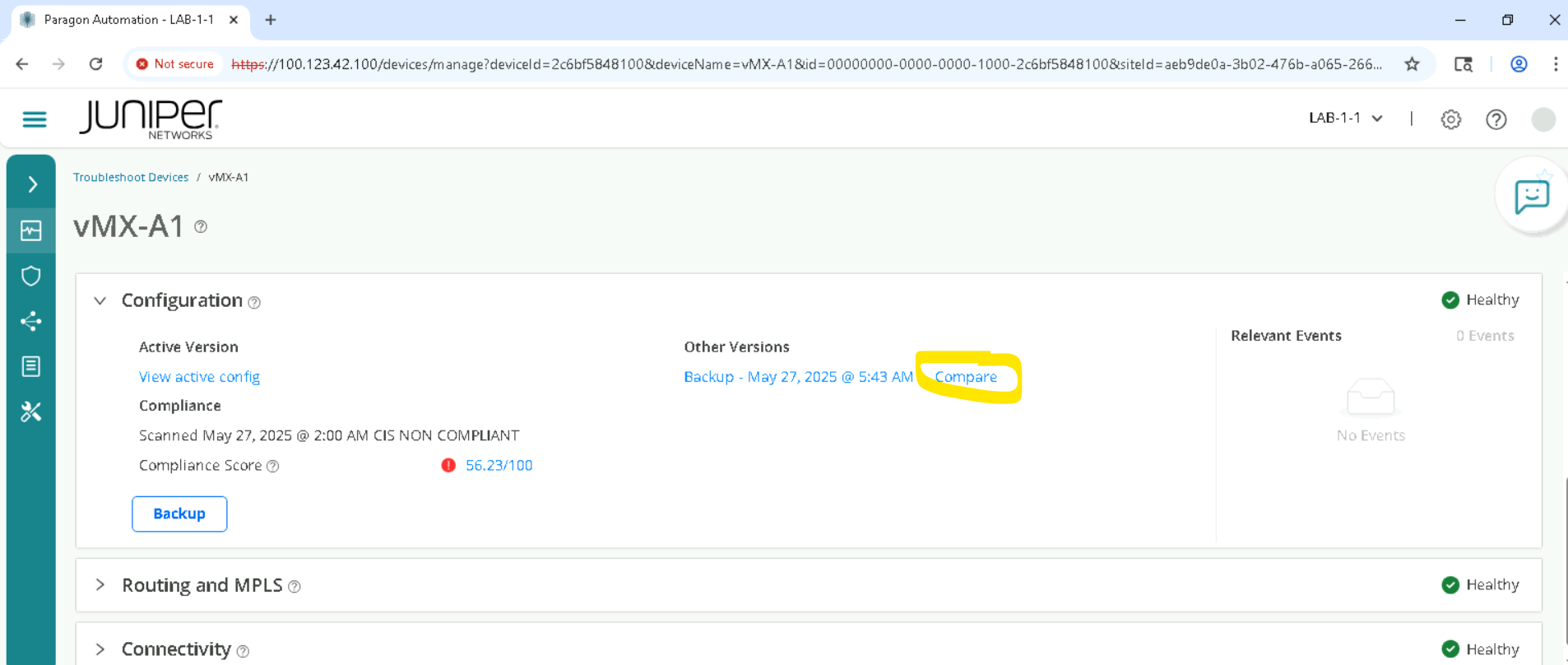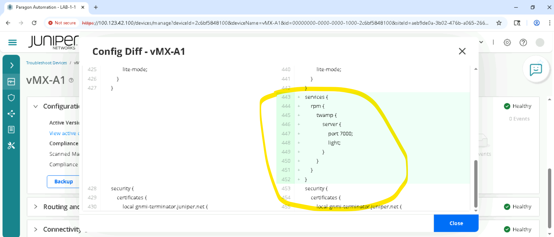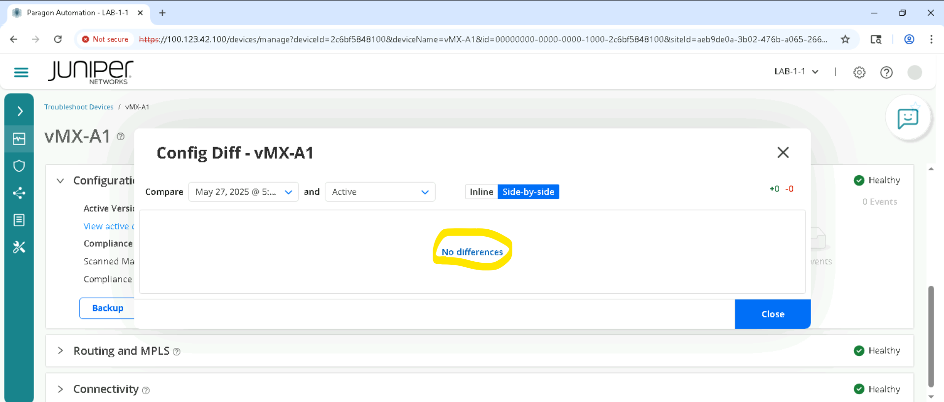 Click on the device, for SETA it will be vMX-A1 and so as to go to Accordion view and click Configuration > Compare