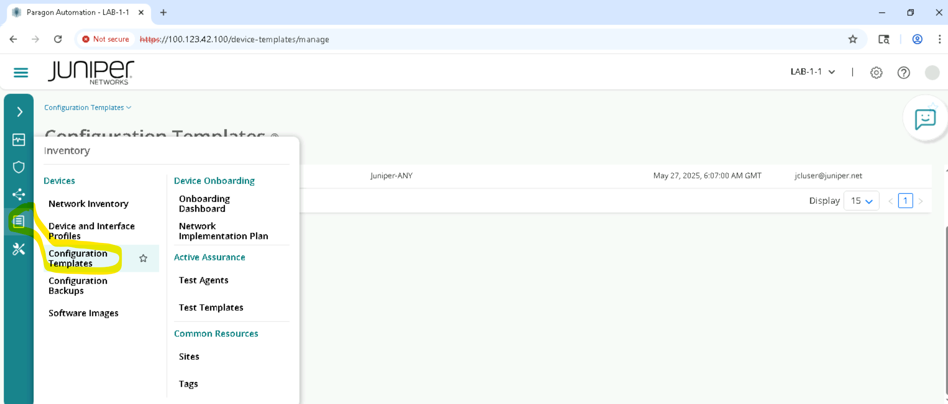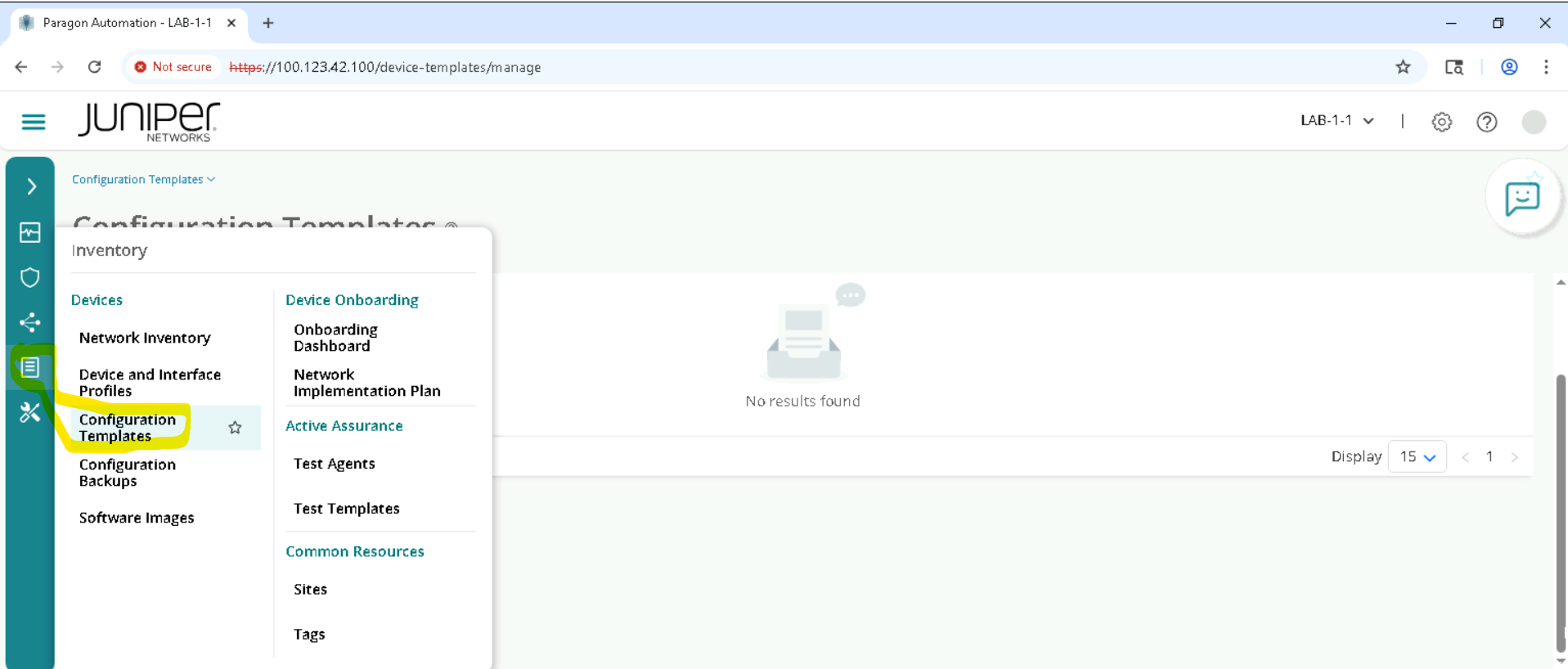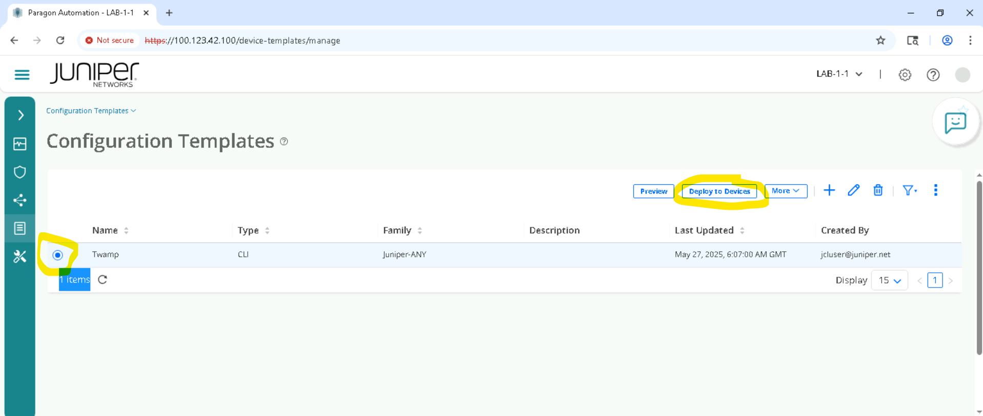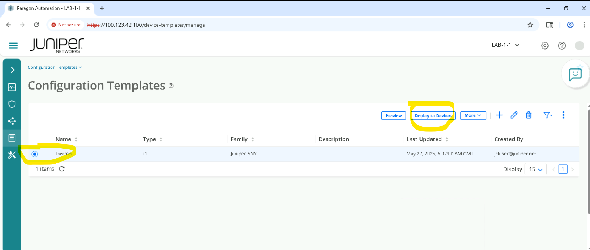 Delete the configurations using the same config template . we have to make sure this step is executed so that we don’t impact the lab. Goto Inventory > Configuration Templates, Select the template and Deploy to devices