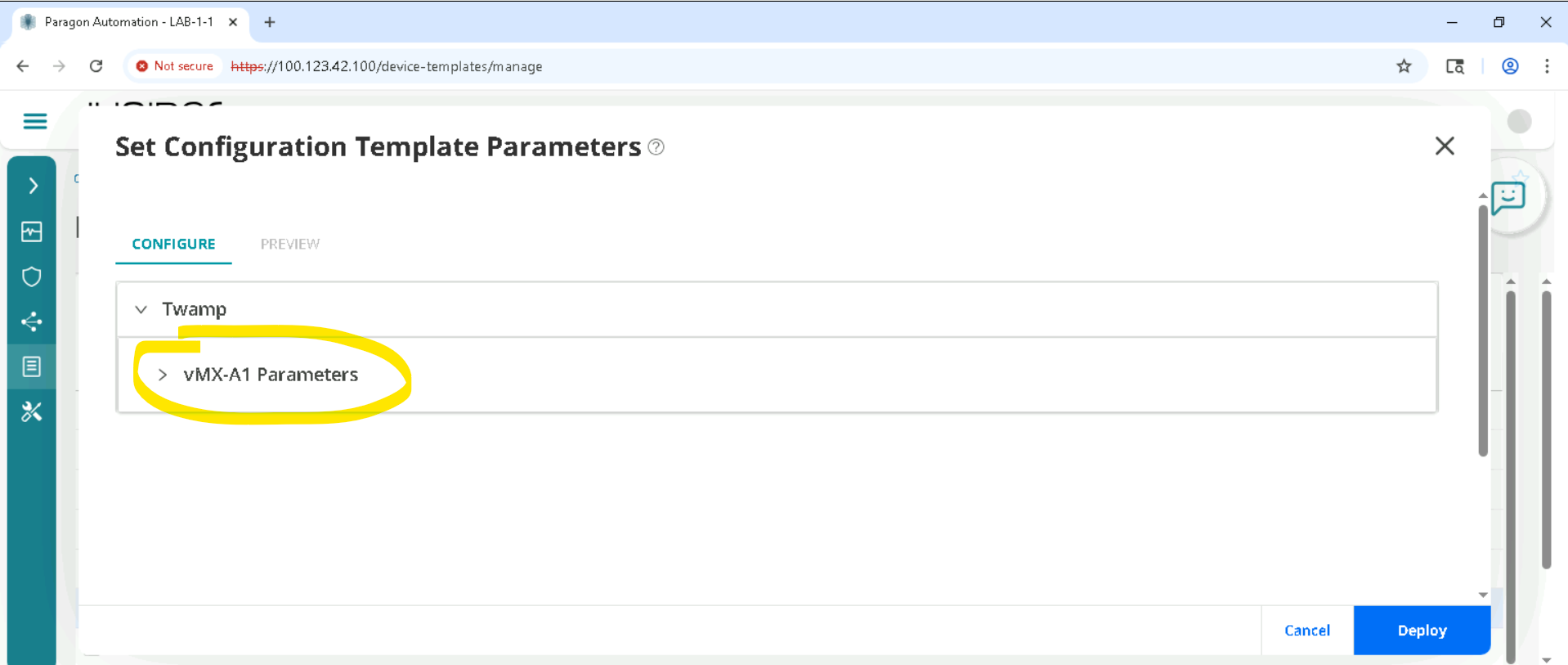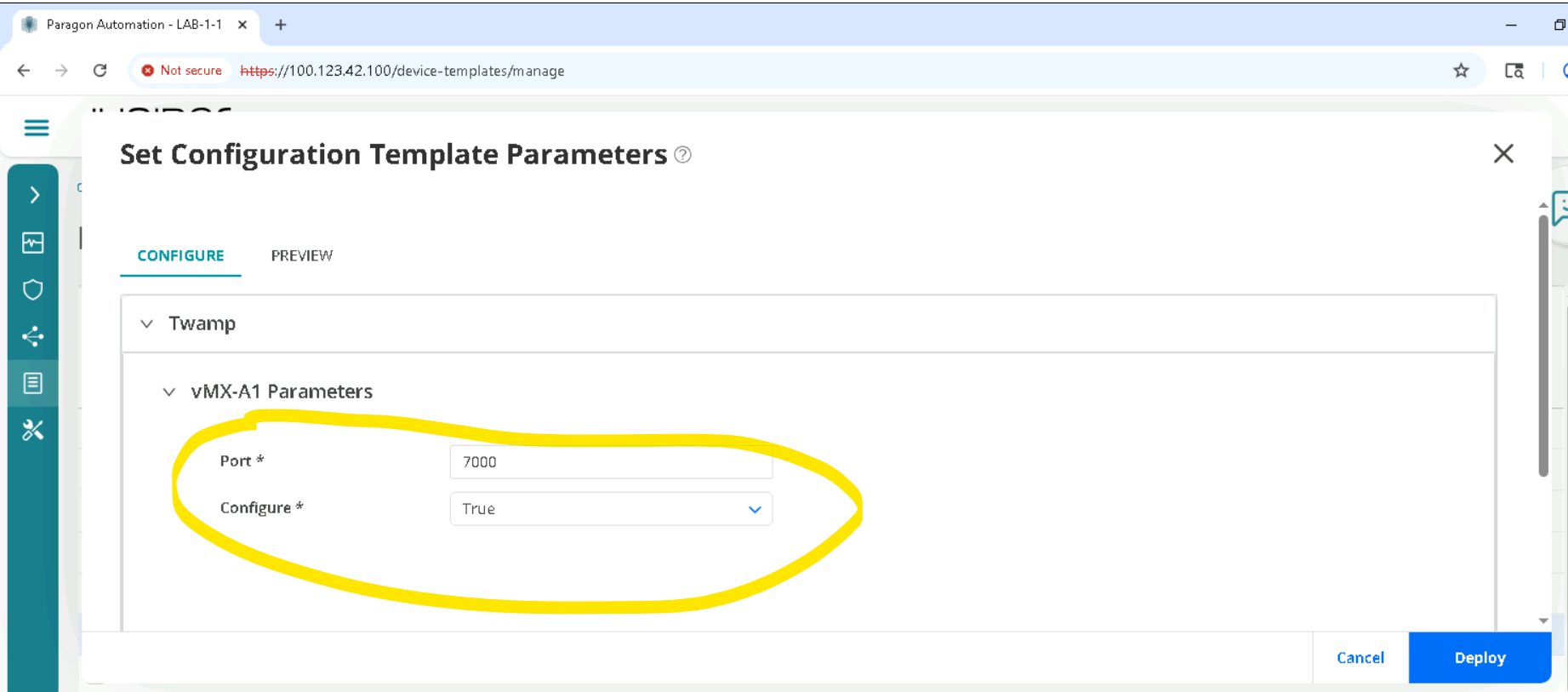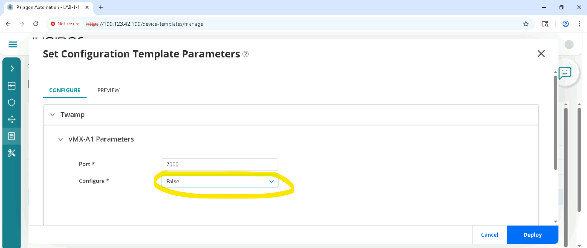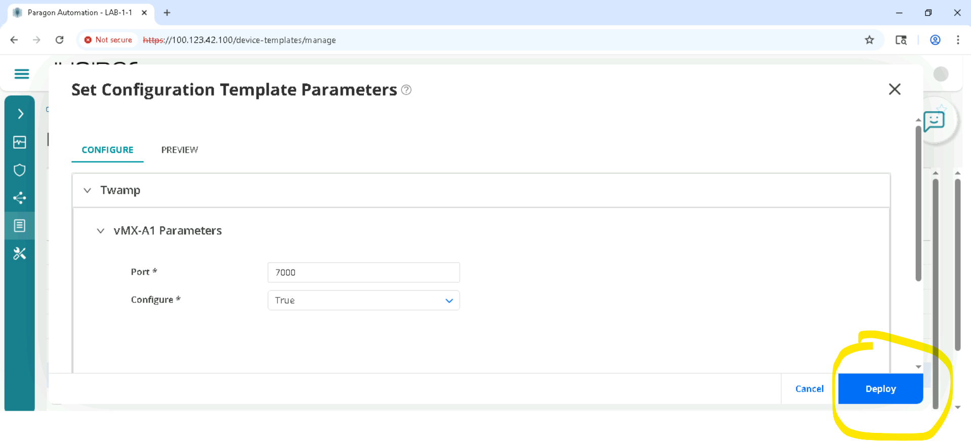 There is no need to change the default , Configure True will configure Twamp, if we set it to False , Twamp config will be removed. Now we want Twamp to be configured so we let it default. Click Deploy