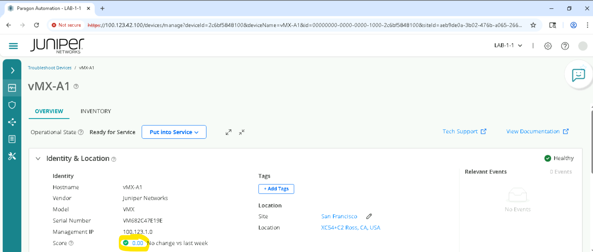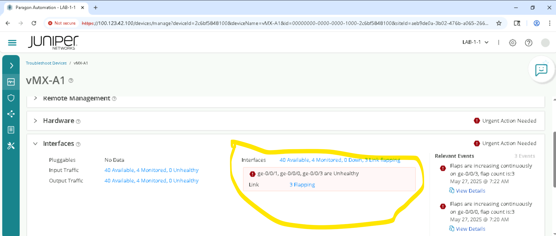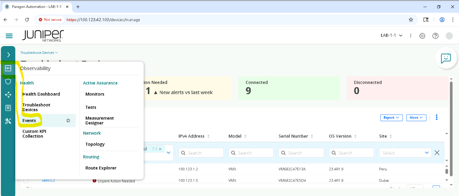 Click on Observability > Events, and review outstanding Alarms, Alerts, and syslog.