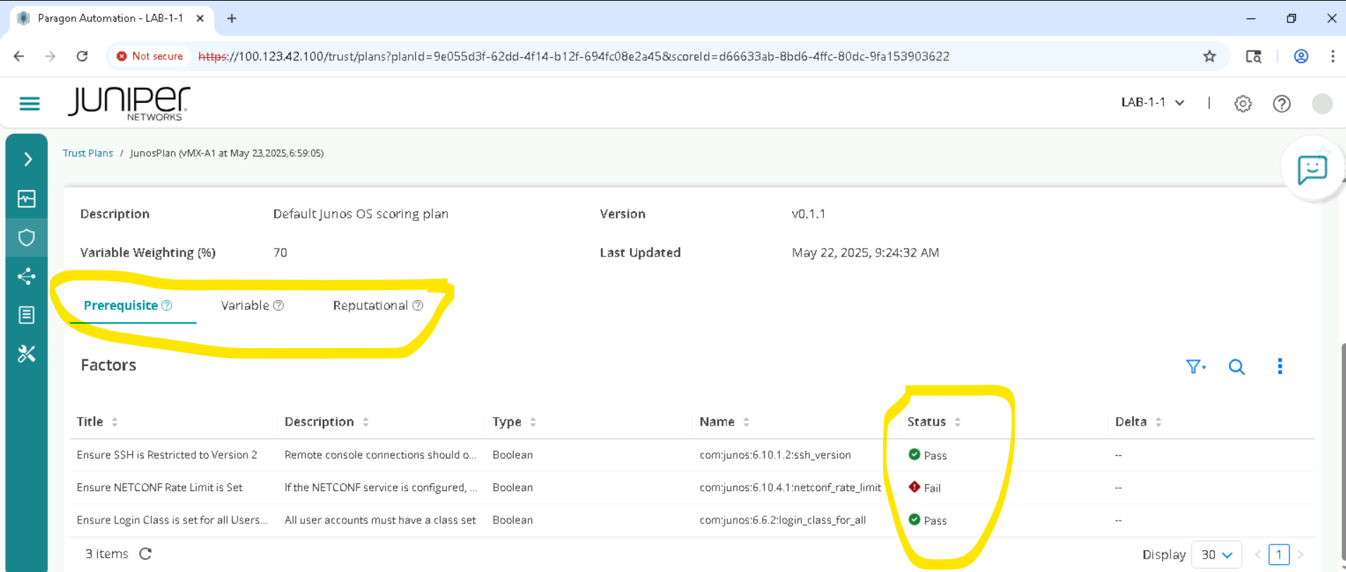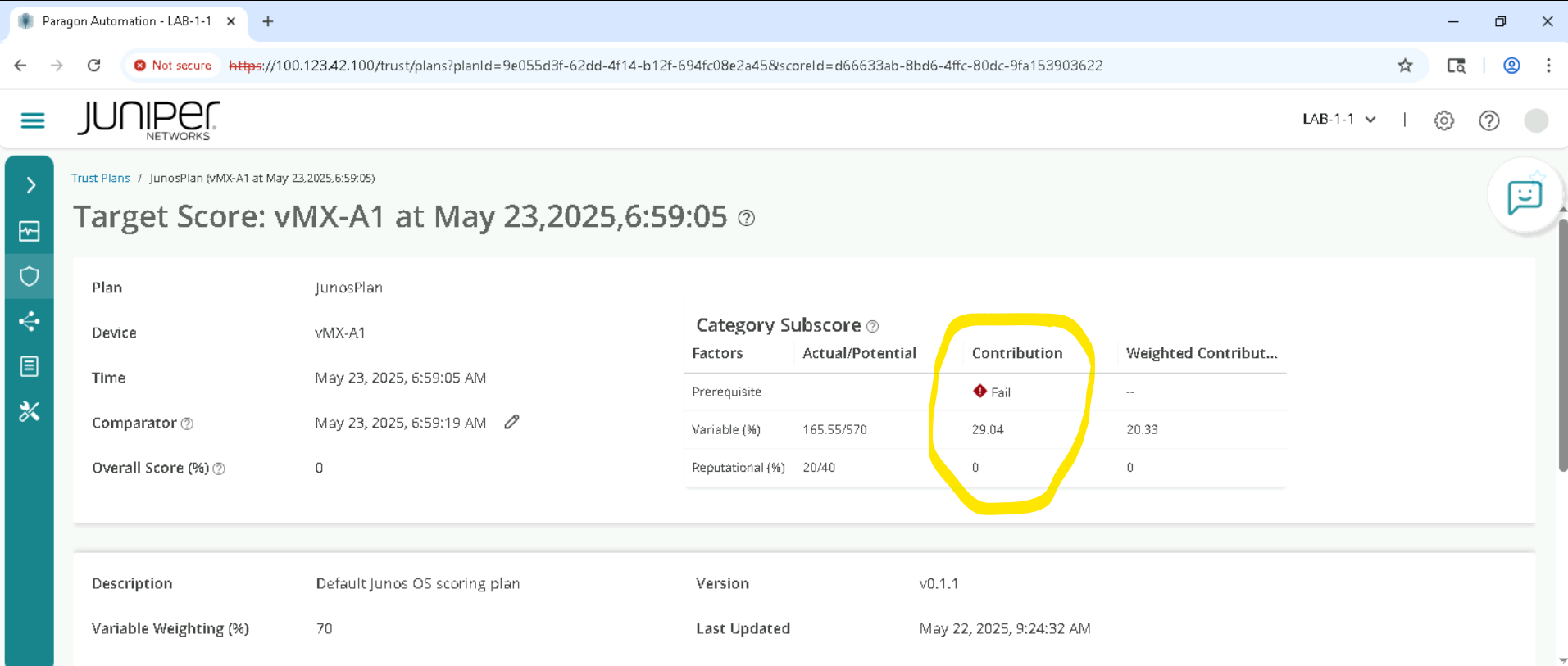 Trust score is a weighted average of Pre requisite Params, Variable and Reputational parameters . the actual contribution is listed as below . Please review each of these and how these impact the current trust score.