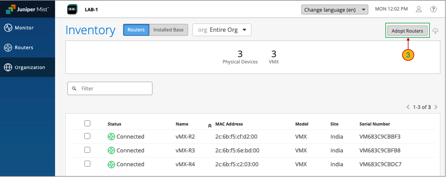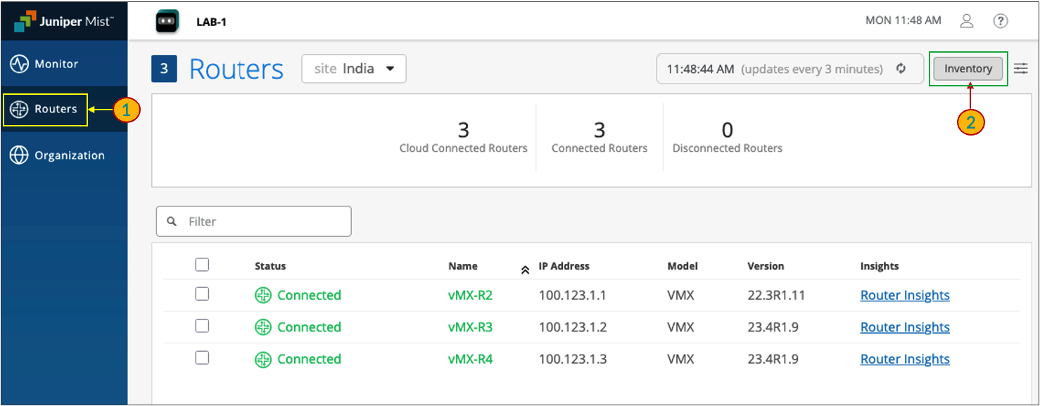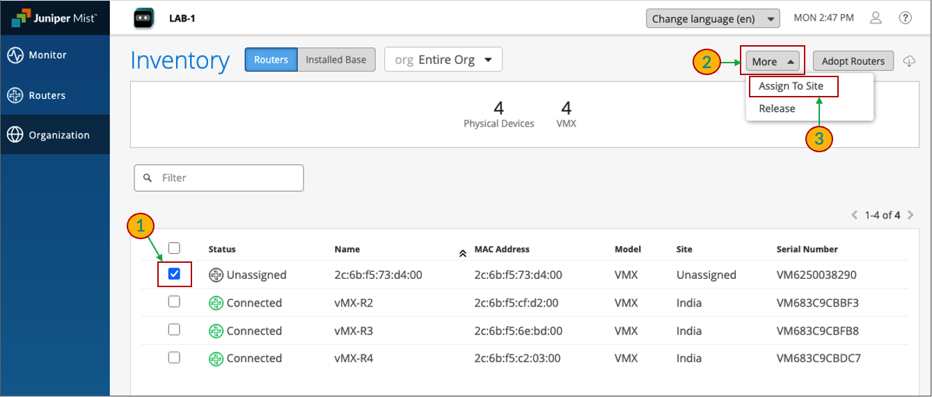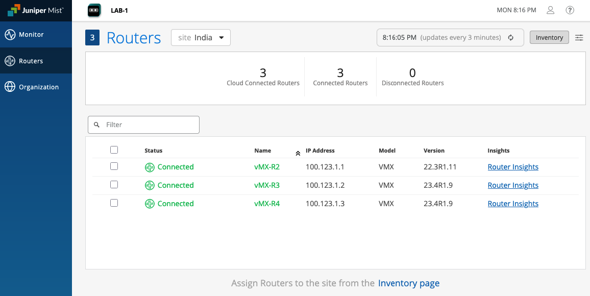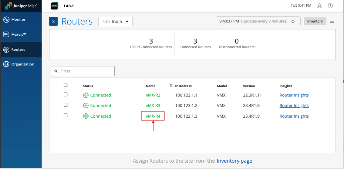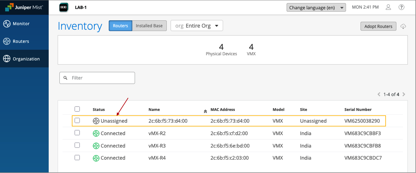 After applying the changes, navigate to Inventory page. The router will appear in the Unassigned state.