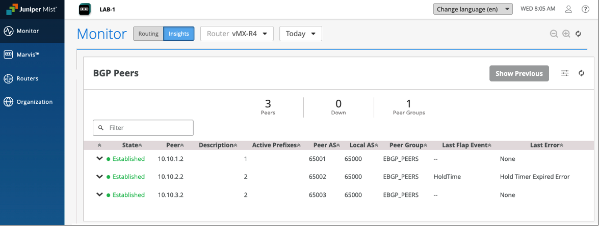 BGP Peers Summary: BGP Peers widget displays BGP peer information table with details such as BGP peer state, last flap event, last error and so on.