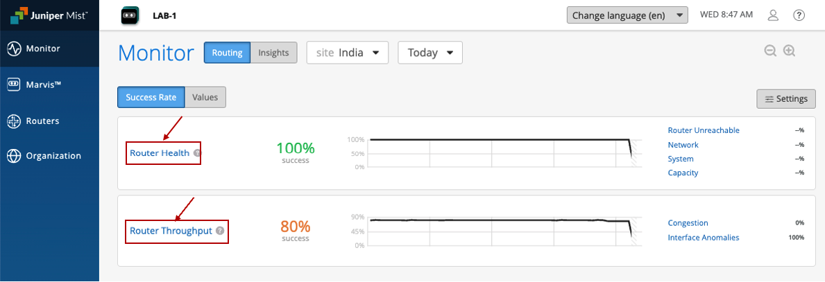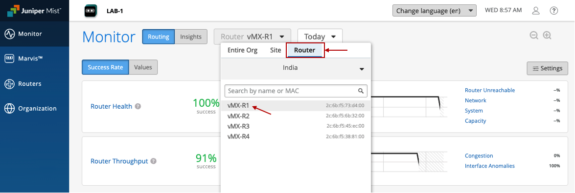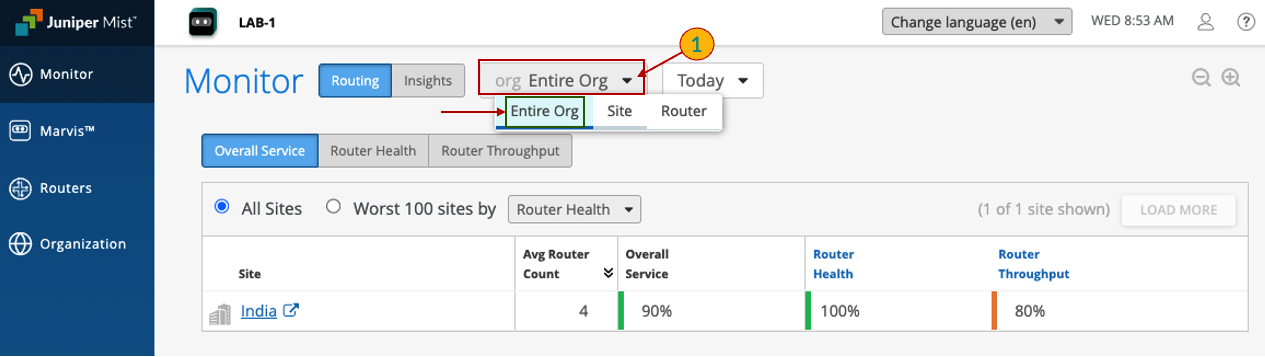 By default, the view shows data for the Entire Org. However, you can filter by a specific Site and even a particular Router to view the Service Level Expectations (SLE) for that specific router within the selected site