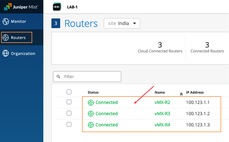 The lab environment consists of four Juniper vMX routers and a pre-configured Juniper Routing Assurance (JRA) platform. The JRA platform includes an existing Organization and Site configuration.