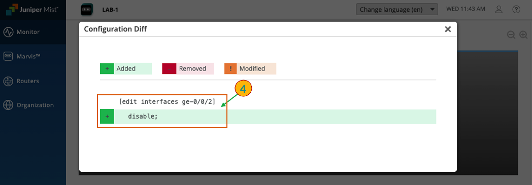 Configuration Diff page appears displaying the configuration changes. Newly added configurations are highlighted in green, removed configurations are highlighted in red and modified configurations are highlighted in amber.