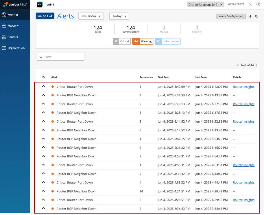 Navigate to the Alerts section, where you’ll observe that the interface has gone down multiple times, resulting in repeated BGP neighborship flaps.