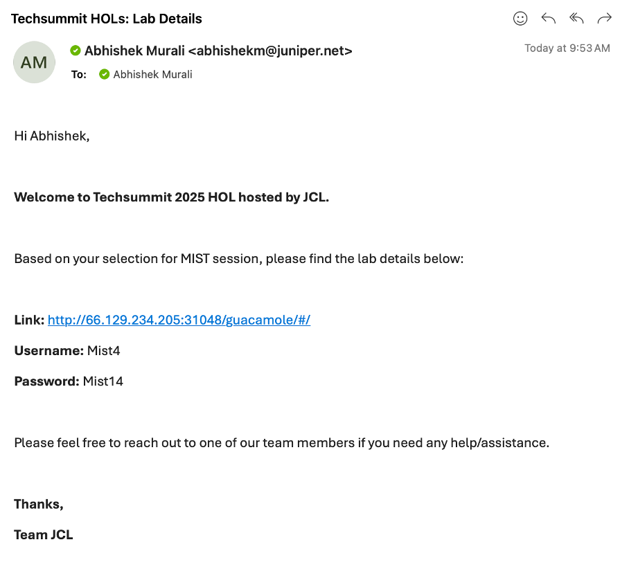 Once you have submitted the form check your inbox and you should have received an email from (_jcl-hol@juniper.net) containing the lab details as show below.