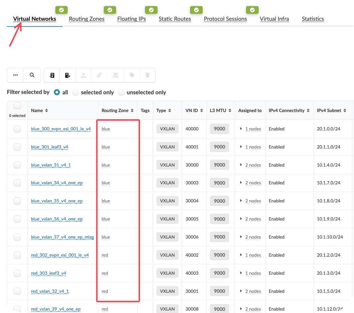 1. After the migration completes, observe that the selected virtual networks now appear under the Red VRF